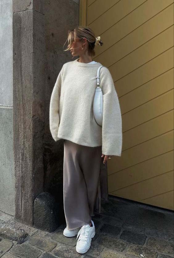 Een favoriete manier om de maxirok te dragen is met een oversized blazer. Staat super chic en classy. Maak je look af met klassieke loafers of stoere boots.